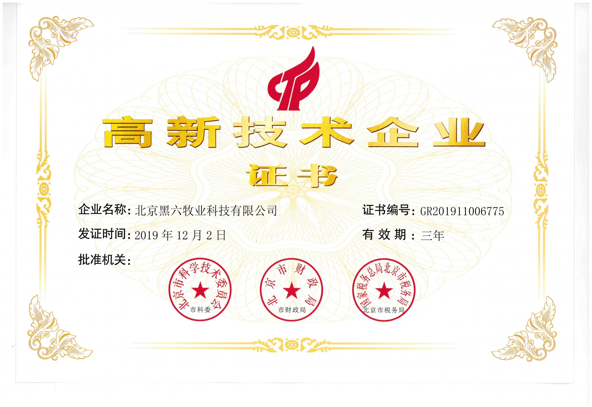 發證機構:   北京市科學技術委員會 發證時間 :   2019-12-02